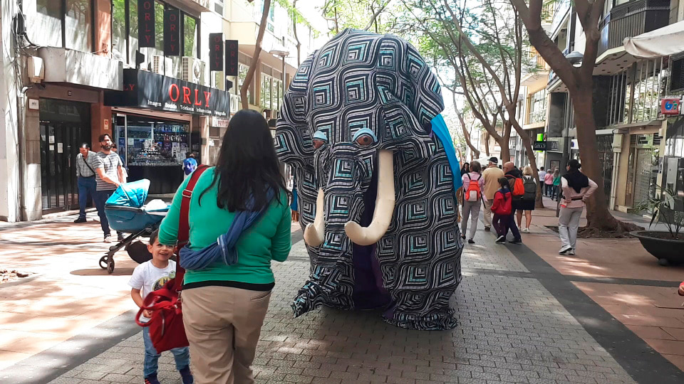Con espectacular tamaño, la familia de artistas caminan por las calles al son de la música pisando fuerte y con graciosos movimientos de trompa.